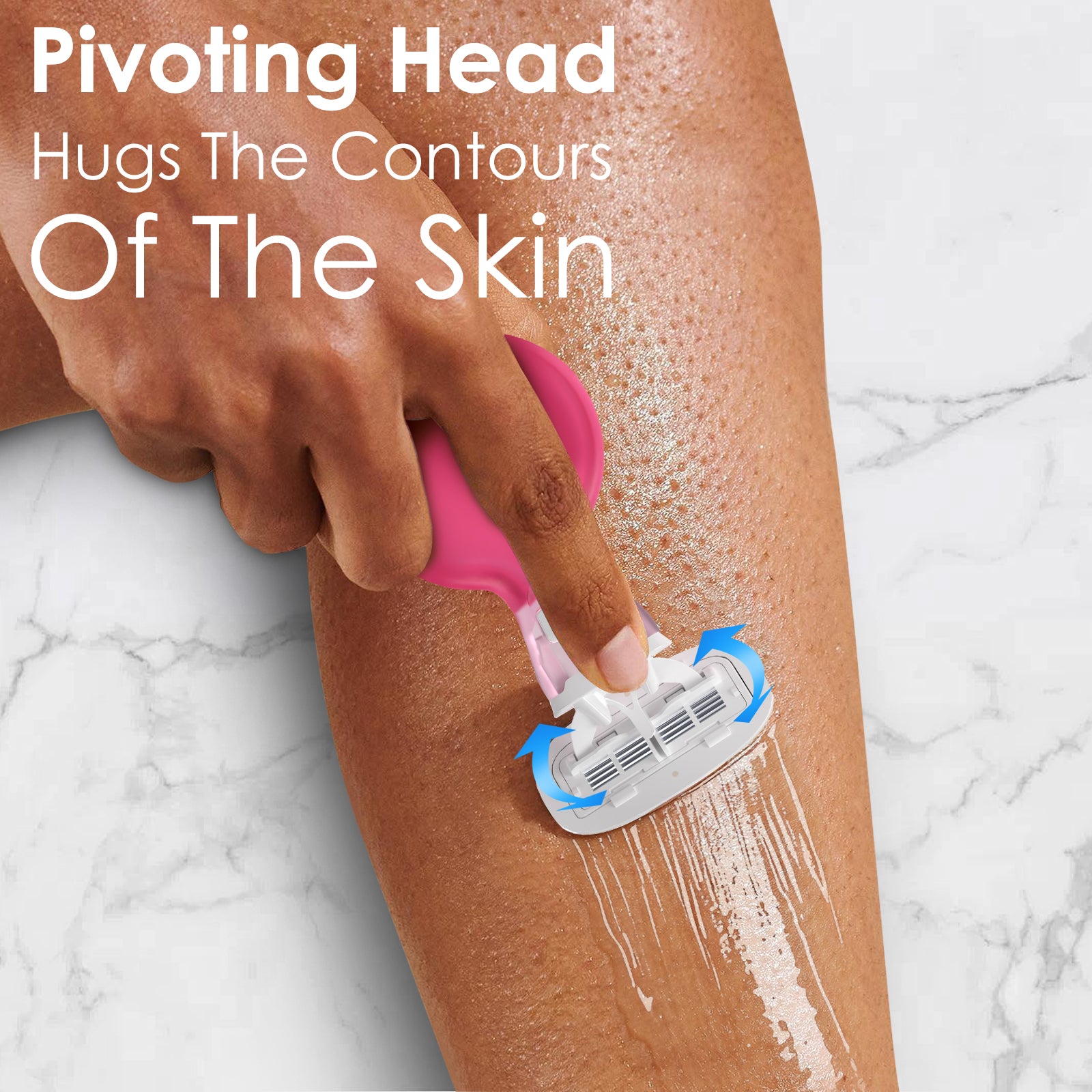 - Extra Smooth Shave: The pivoting head with 5 premium stainless steel blades that hugs the contours of your legs, ankles, and body to provide a close and comfortable shave. Gentle on sensitive skin, with less irritation and razor burn